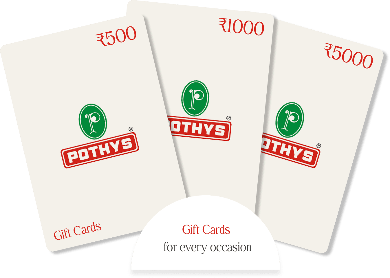 Gift your dear ones with Pothys Gift Card. This card can be redeemed at any Pothys Store with one year validity from issue date. Card will be delivered to your dear ones at their address.