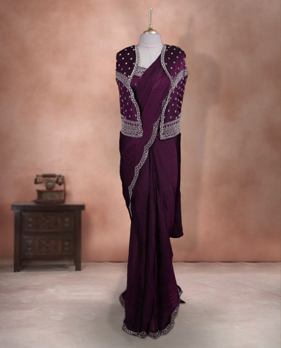 White colour pure organza saree featuring Grape Colour floral prints with intricate bead and sequin work across the body, adorned with a matching embellished border, complemented by a worked pallu and paired with a heavily worked matching blouse. White colour pure organza saree featuring Grape Colour floral prints with intricate bead and sequin work across the body, adorned with a matching embellished border, complemented by a worked pallu and paired with a heavily worked matching blouse.