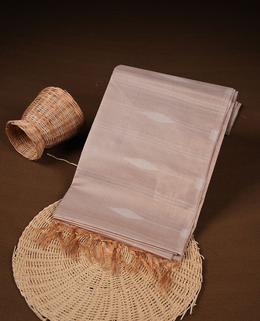 Light brown colour semi tusser silk saree featuring geometric print pattern across body, gold zari border with style motifs and paired with matching blouse.